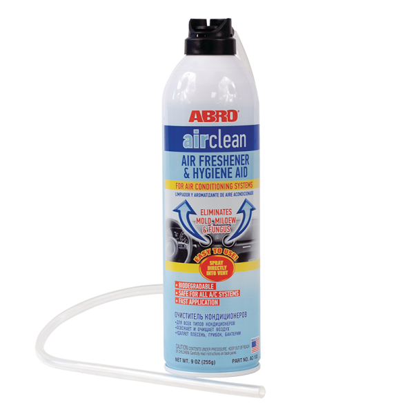 ABRO Air Clean air freshener & Hygiene aid is formulated to be sprayed into the vehicles air conditioning system to effectively clean and remove mould, mildew and fungi that can build up in the system over time. The product is fully biodegradable and leaves a fresh clean smell.