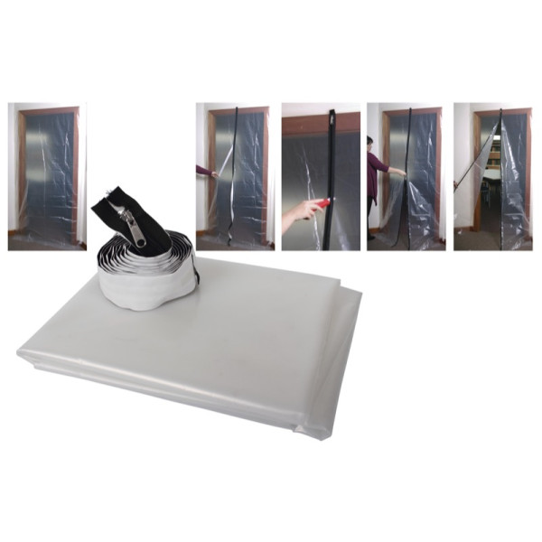 - Simple to set up: tape sheet to door, fix pre-taped zip and cut down middle for easy two-way access whilst work is in progress
