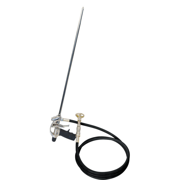 Heavy duty metal PU foam gun for the application of foam adhesives. Available in 2 different versions, 1 with regular threaded adapter and 1 with connected hose with an adaptor for Soudal canister foam adhesives. Barrel length available in 60cm long and 1m extra long.