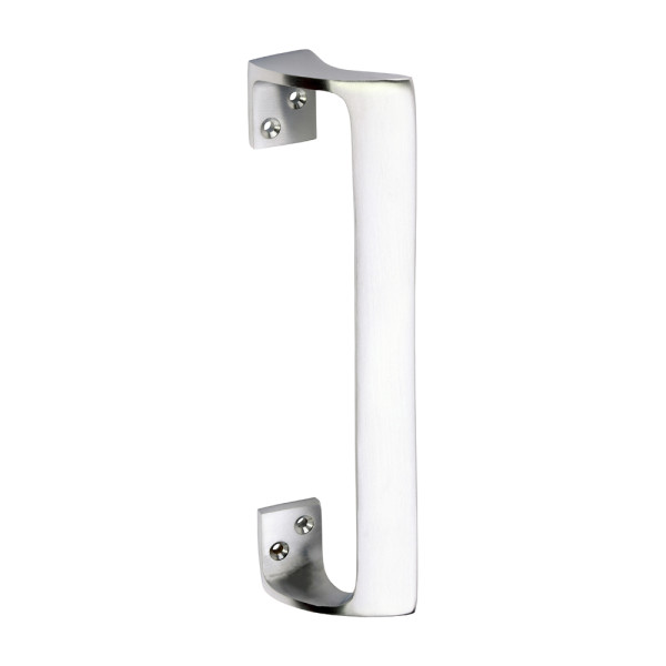 A door pull handle with off-set oval grip.